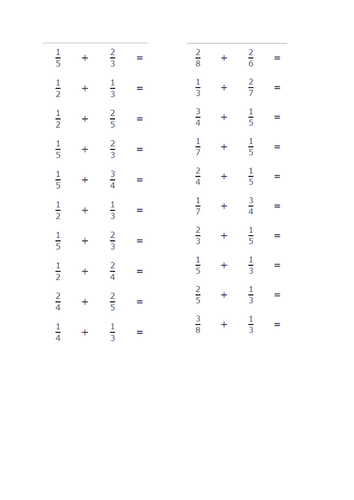 Math worksheets adding fractions like denominators. › adding-threeAdding Three Fractions Worksheets - Math Worksheets 4 Kids A stack of crackling-with-excellence resources ideal for regular practice and in-class assessments, these pdf worksheets are designed with a desire to shepherd kids in grade 4, grade 5, and grade 6 students through the odds of adding three fractions with like and unlike denominators. Grab the free worksheets for a perfect start! Adding fractions (like denominators) - K5 Learning Title: Grade 4 Fractions Worksheet - Adding fractions (like denominators) Author: K5 Learning Subject: Grade 4 Fractions Worksheet Keywords: Grade 4 Fractions Worksheet - Adding fractions (like denominators) math practice printable elementary school Browse Printable Fraction Worksheets | Education.com The first time kids discover that there’s more to math than whole numbers, they are likely to be a tad confused. And sometimes that confusion extends throughout the entirety of elementary school, where an initial introduction to concepts like numerators and denominators is followed by comparing fractions, adding and subtracting fractions, multiplying fractions, simplifying … › math-fractionsMath Fractions Worksheets Here you will find a selection of Fraction Worksheets based on adding and subtracting fractions. The sheets start with adding and subtracting fractions with the same denominator, then progress on to fractions with different denominators.
